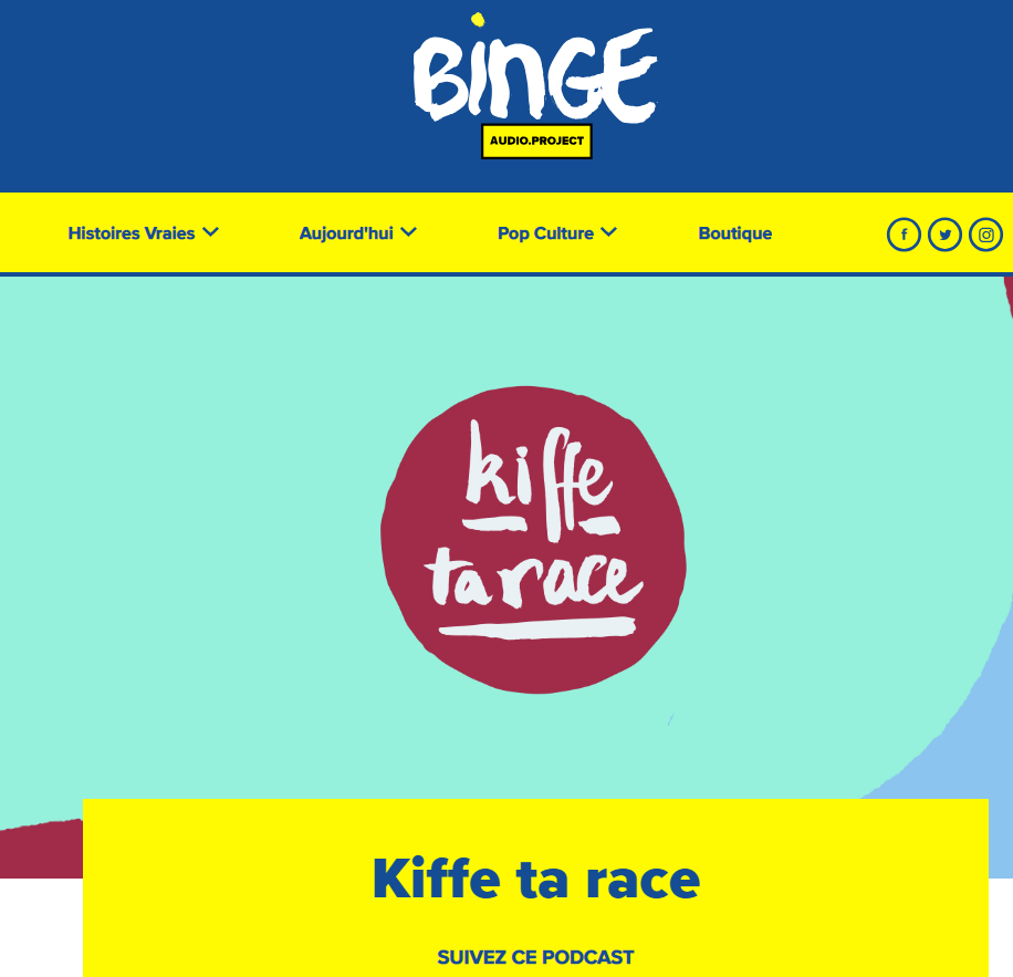 pour le site Binge Audio. "Le parti pris de Kiffe ta race, c'était d'avoir un dialogue apaisé sur les questions raciales. Il n'existe pas d'espace médiatique aujourd'hui pour parler des questions raciales, du féminisme intersectionnel, sans que ce soit présenté comme un problème, comme quelque chose d'anxiogène, ou qu'on se retrouve face à des contradictions virulentes."