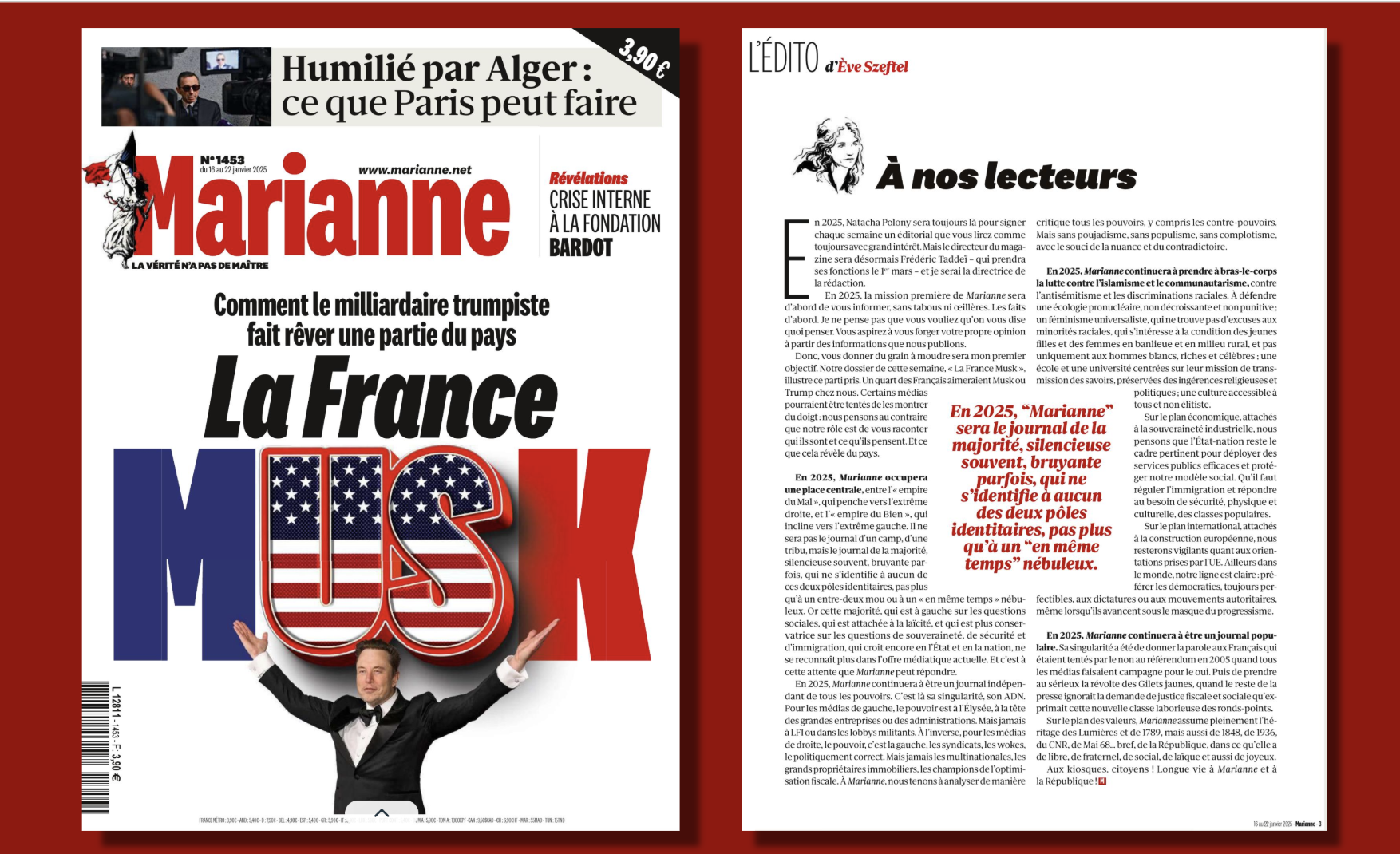 La ligne de Marianne qu'Eve Szeftel entend poursuivre, développe-t-elle encore dans son mail d'au-revoir, est une "ligne républicaine et sociale, universaliste et laïque, aussi intraitable avec l'antisémitisme qu'avec le racisme" du magazine. Dans le communiqué de CMI, elle s'engage à livrer "une information rigoureuse et sans œillère idéologique". Elle se positionne à nouveau dans son premier édito, publié dans le numéro du 16 janvier. "En 2025,