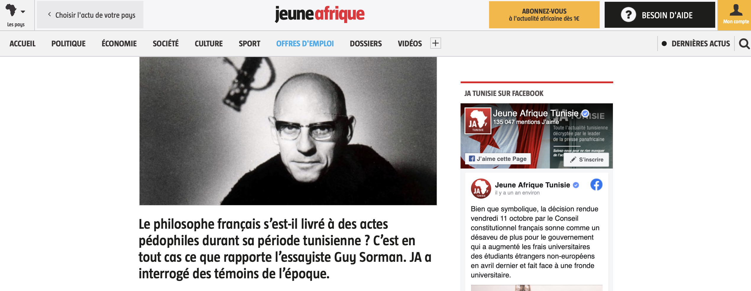 "Michel Foucault n’était pas pédophile, mais il était séduit par les jeunes éphèbes". Voilà un titre tout en quête de nuance de Jeune Afrique (JA), en tête d'un article paru ce jeudi 1er avril. Aucun calembour ichtyologique ici : c'est l'intitulé d'une courte contre-enquête réalisée par le magazine. On y apprend que l'auteur de Surveiller et punir avait l'habitude d'avoir des rapports sexuels avec des jeunes hommes lorsqu'il vivait en Tunisie, dans le village de Sidi Bou Saïd, alors qu'il enseignait la philosophie à la Faculté des lettres et sciences humaines de Tunis depuis 1965, comme le rappelle JA.