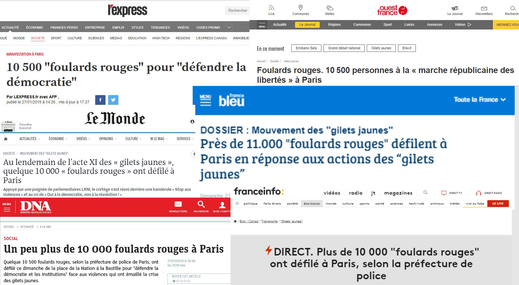 En cette soirée du dimanche 27 janvier, la préfecture de police rend son verdict : la "Marche républicaine pour les libertés" des foulards rouges, ces manifestants réunis pour soutenir les institutions et protester contre les violences des cortèges Gilets jaunes, aurait réuni 10 500 personnes. Un chiffre qui, fait rare, n'a pas été remis en cause par les organisateurs de la manifestation, qui avaient eux-mêmes tablé sur une participation d'au moins 10 000 personnes. Un chiffre repris par tous les médias, télés, radios, papier.