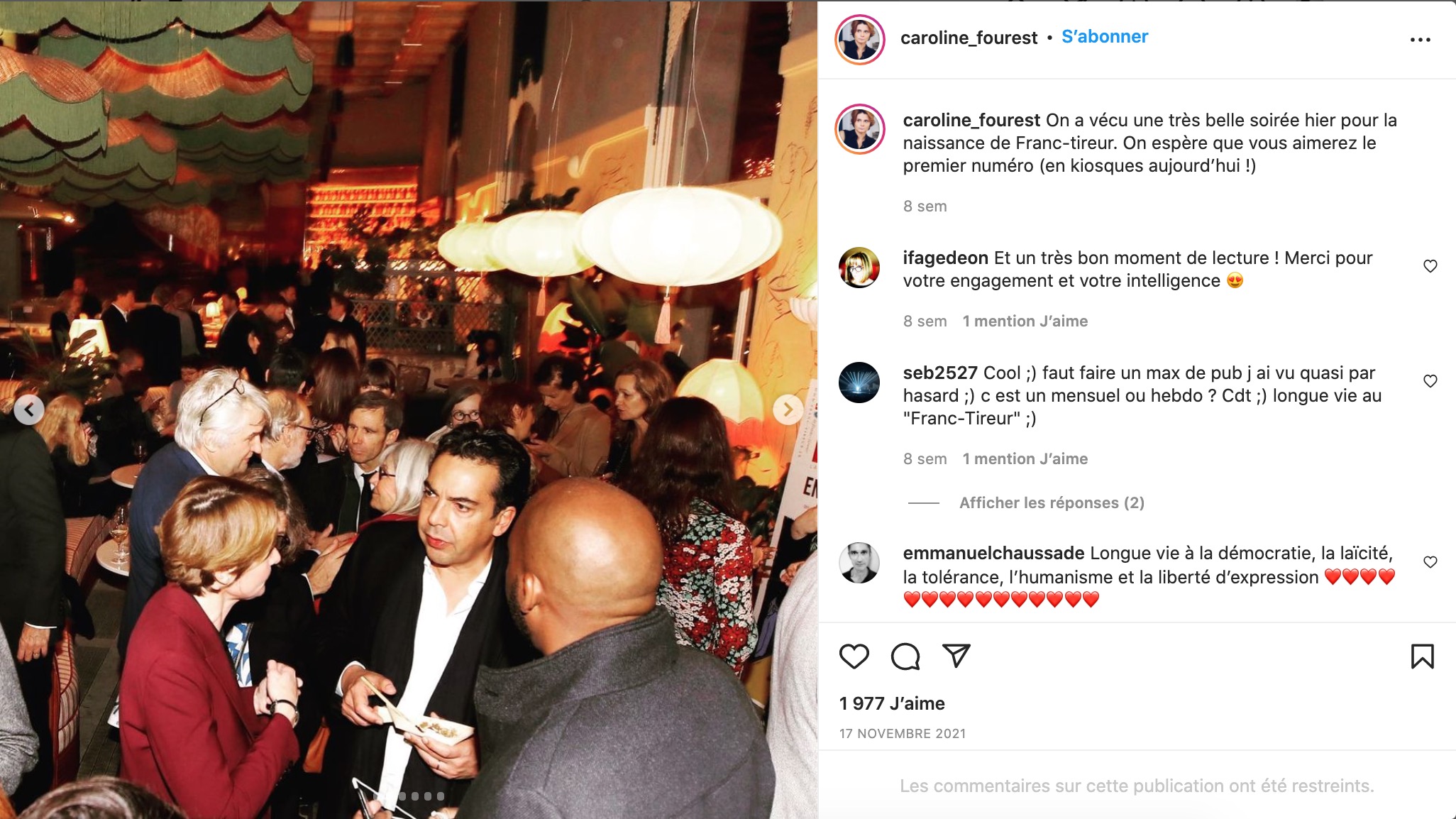 , magazine auquel collabore Caroline Fourest et dont elle est "conseillère éditoriale". Thomas NLend était également présent à la soirée de lancement de Franc-Tireur