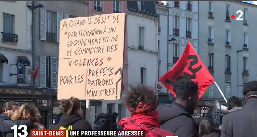 Deux jours plus tôt, une professeure du collège Elsa-Triolet, à Saint-Denis, a été agressée par un ancien élève, entré dans une classe en cassant une fenêtre et prétendant commettre "un attentat". Pistolet à billes à la main, il a tiré a plusieurs reprises sur la professeure. Immédiatement, les enseignants se sont mis en grève. Samedi 13 avril, l'événement intéresse une dizaine de journalistes dont France 2 et TF1. Ils se rendent à Saint-Denis pour interviewer des enseignants, à l'endroit où se déroule la manif hebdomadaire contre la loi Blanquer. La présence de ces nombreux journalistes intrigue un enseignant, qui écrit à Arrêt sur images : "