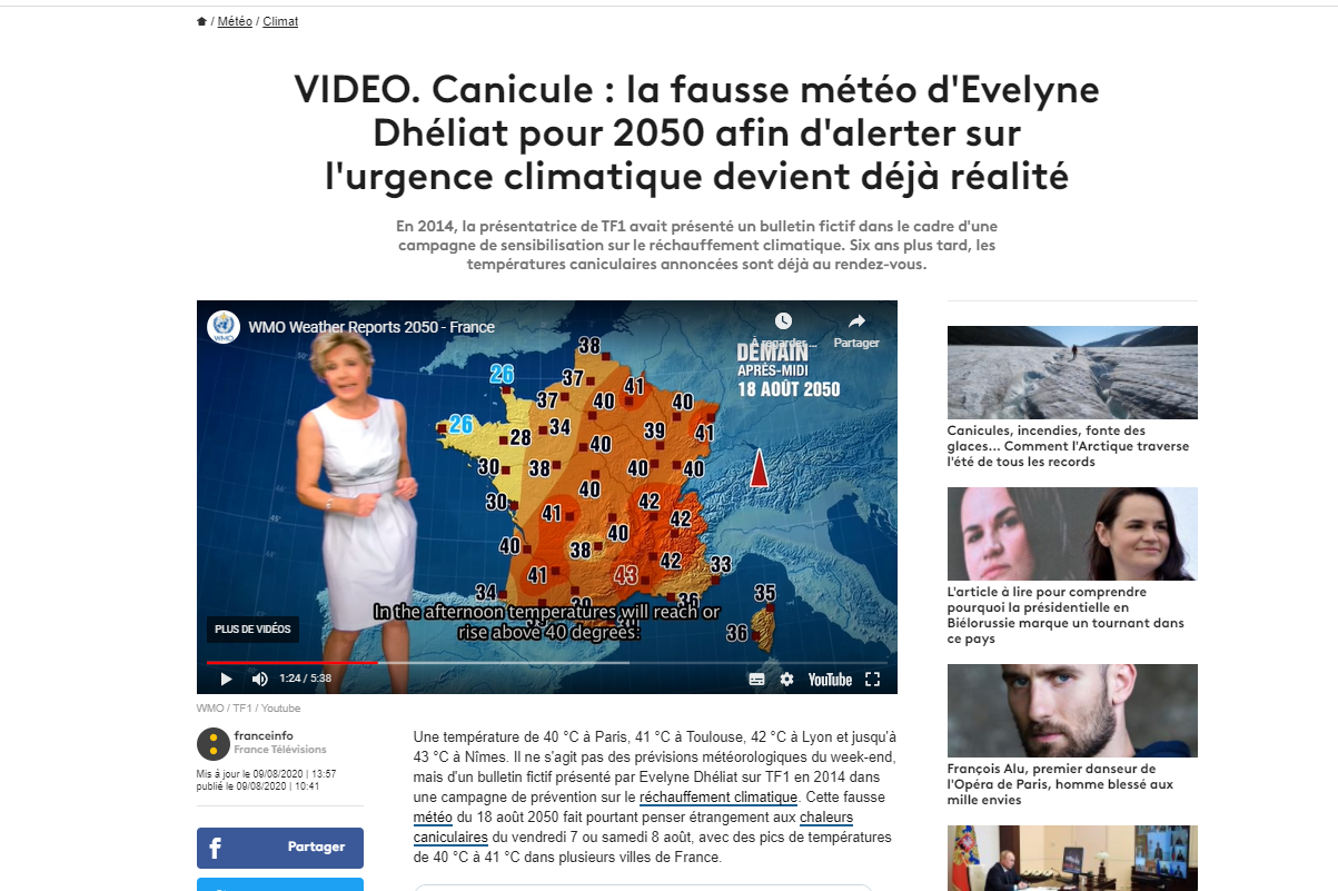 Dimanche 9 août, le site de Franceinfo a republié la célèbre fausse météo d'Evelyne Dhéliat pour 2050. Un bulletin fictif réalisé dans le cadre d'une campagne de sensibilisation sur le réchauffement climatique, dont les températures caniculaires, six ans plus tard, sont hélas d'actualité. Quelques jours auparavant, Franceinfo - et bien d'autres médias - informait de la désintégration de la dernière plateforme glacière de l'Arctique canadien, et du glacier italien du Mont-Blanc au bord de l'effondrement, "la faute au réchauffement climatique"