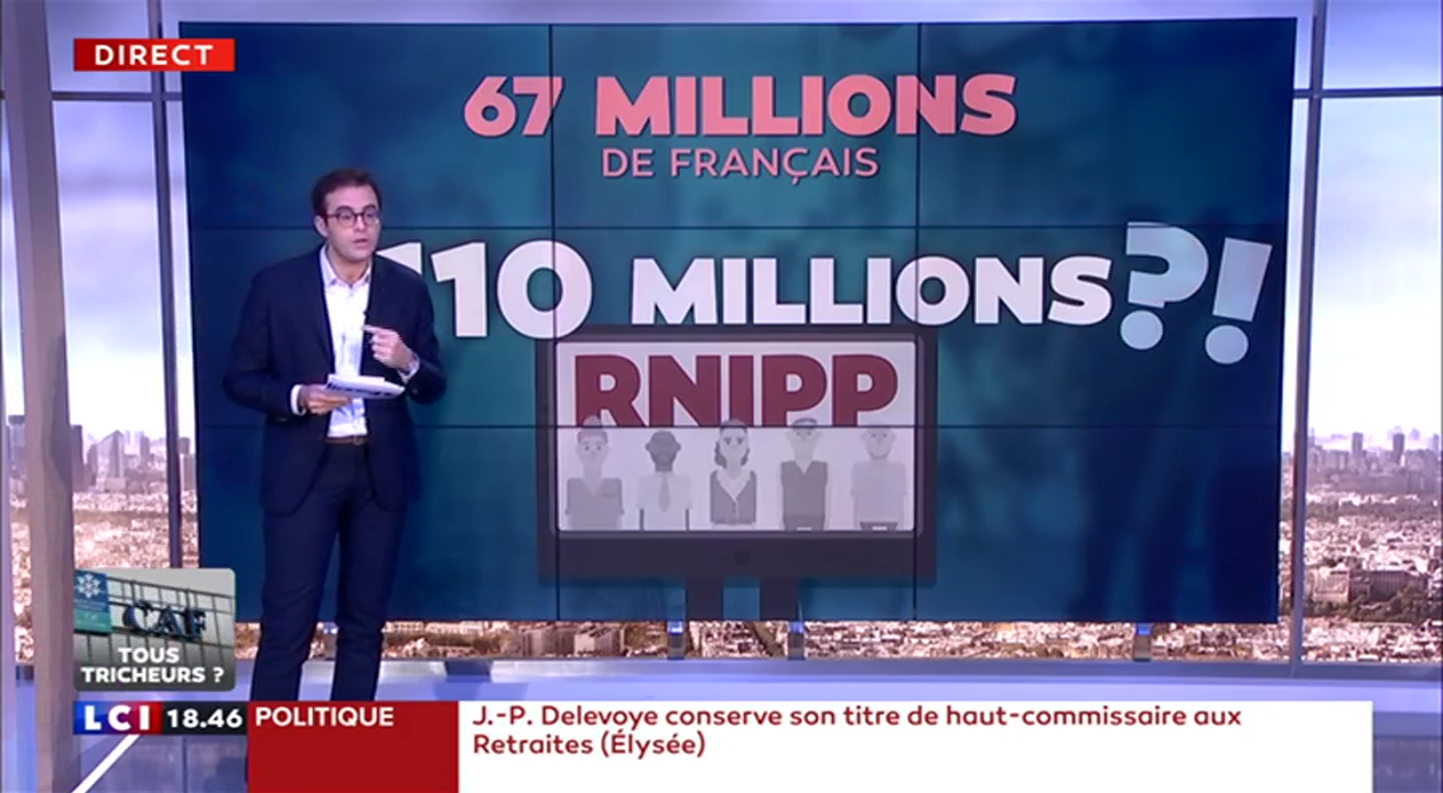 ", s'alarme Pujadas. Pensez-vous : alors que l'INSEE ne recense que 67 millions d'habitants en France, le répertoire national d'identification des personnes physiques (RNIPP) en recense 110 millions, dont 84 millions de personnes "réputées en vie" (auxquelles ont donc été attribués des numéros de Sécurité sociale).