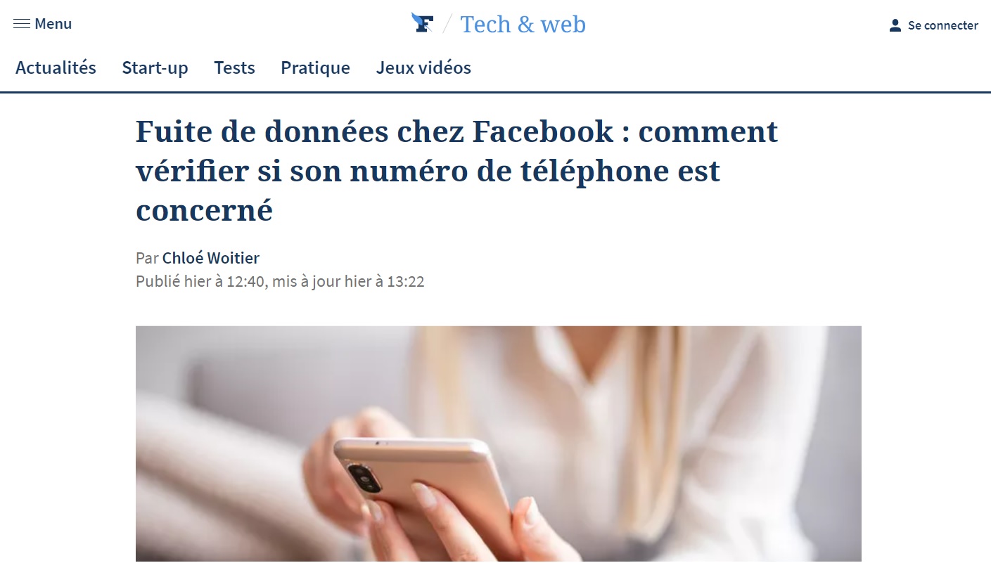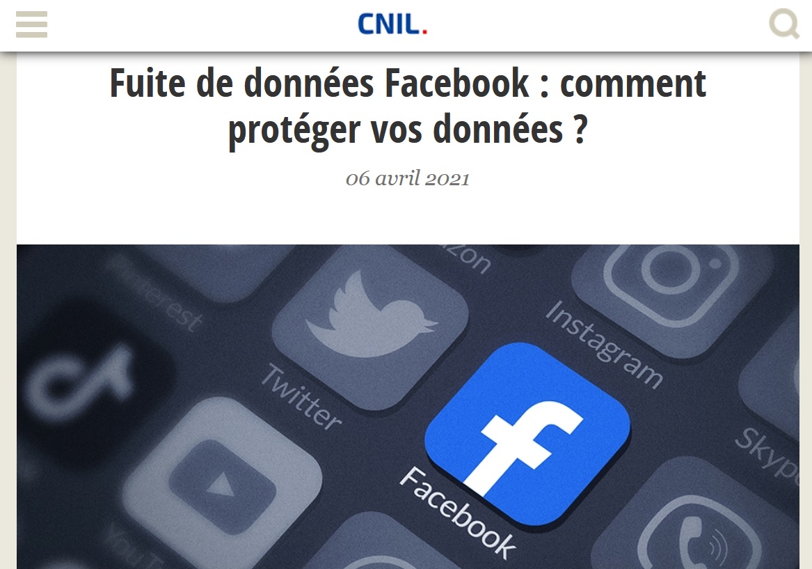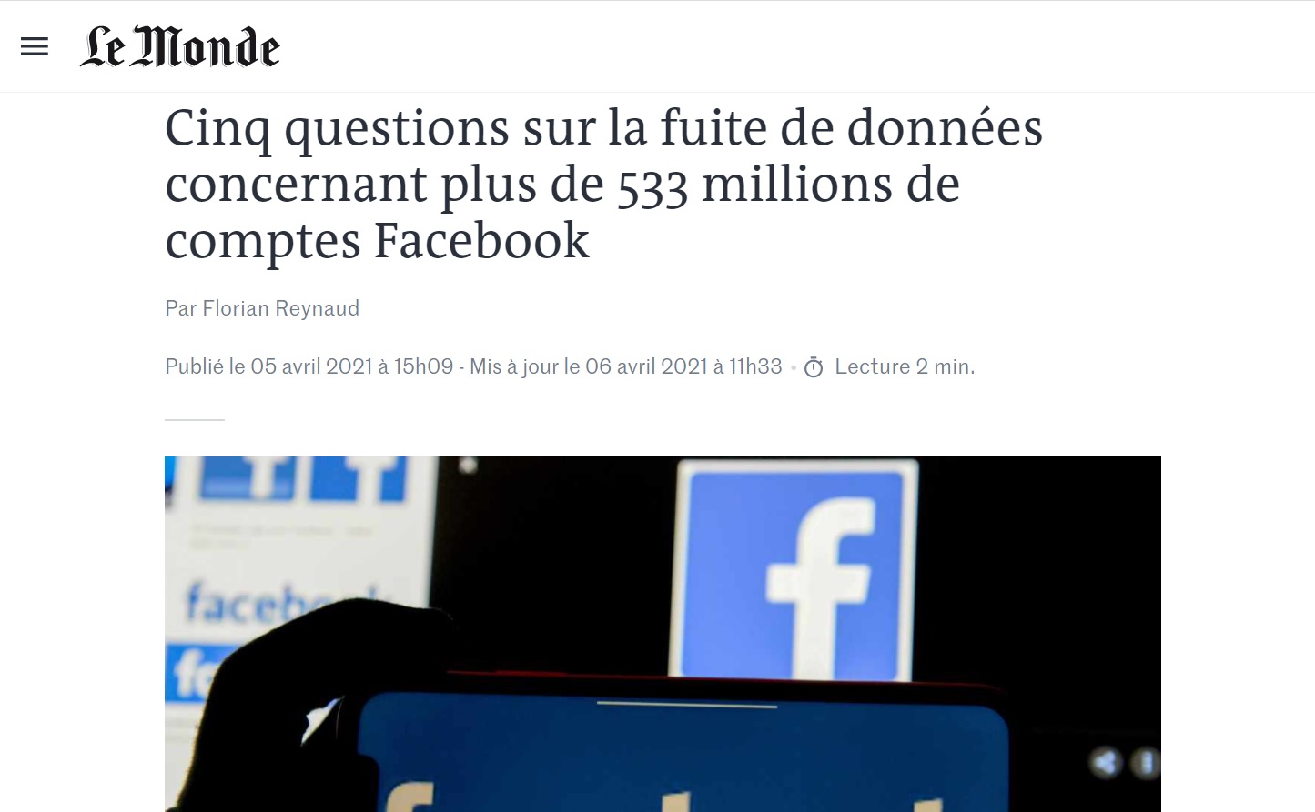 Le 3 avril 2021, une base de données d'un demi-milliard d'utilisateurs de Facebook dans le monde (sur 2,8 milliards d'utilisateurs) est soudainement devenue publique et gratuite. Après avoir été vendue discrètement et à prix d'or pendant près de deux ans, cette base est désormais accessible sur le web, en quelques minutes ou quelques heures de recherches – bien que son téléchargement soit illégal. En France, 20 millions de personnes, soit la moitié des 40 millions d'utilisateurs de Facebook, voient ainsi leur numéro de téléphone portable dévoilé, accompagné de leur nom et de l'identifiant de leur profil sur le réseau social, et aussi, s'ils les avaient renseignés, leur statut de célibataire ou "en couple", leur employeur, leur adresse, et plus rarement leur adresse courriel. Pourtant, du côté du gouvernement, c'est silence radio depuis cinq jours – aucune communication publique