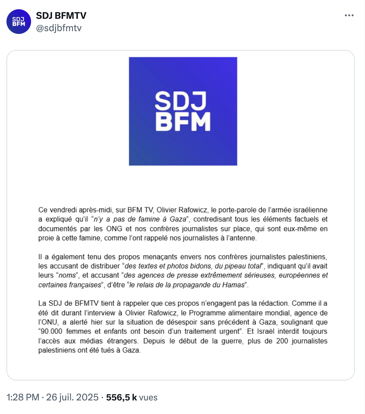 L'embarras suit dans la rédaction de la chaîne. Le lendemain, la Société des Journalistes de BFMTV prend ses distances, via un post publié sur X : "La SDJ de BFMTV tient à rappeler que ces propos n'engagent pas la rédaction". Ils et elles rappellent que les mots employés par le colonel "contredis[e]nt tous les éléments factuels et documentés par les ONG et nos confrères journalistes sur place, qui sont eux-mêmes en proie à cette famine, comme l'ont rappelé nos journalistes à l'antenne".
