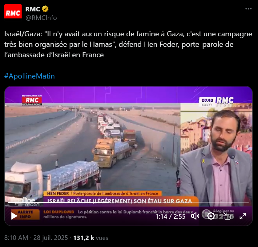Invité par Jean-Wilfrid Forquès dans son émission de 18h, le porte-parole de l'armée israélienne était amené à réagir sur la reconnaissance française de l'État palestinien suite aux déclarations d'Emmanuel Macron. "Avant de vous répondre, si vous le permettez, je voudrais répondre aux accusations mensongères de famine et de génocide" ; en réalité, Olivier Rafowicz ne répondra jamais à la question de Jean-Wilfrid Forquès. Il profite de ce moment pour répandre plusieurs contre-vérités et diffuser sa propagande militaire : l'aide humanitaire des Nations Unies serait détournée par le Hamas, des mensonges démentis par l'USAID, l'agence de développement du gouvernement américain. Jean-Wilfrid Forquès tente de le recadrer, mais le colonel continue, "attendez, je finis". Le journaliste arrive finalement à lui soumettre les chiffres du Programme Alimentaire Mondial (PAM) : 90 000 femmes et enfants ont besoin d'un traitement nutritionnel d'urgence à Gaza.