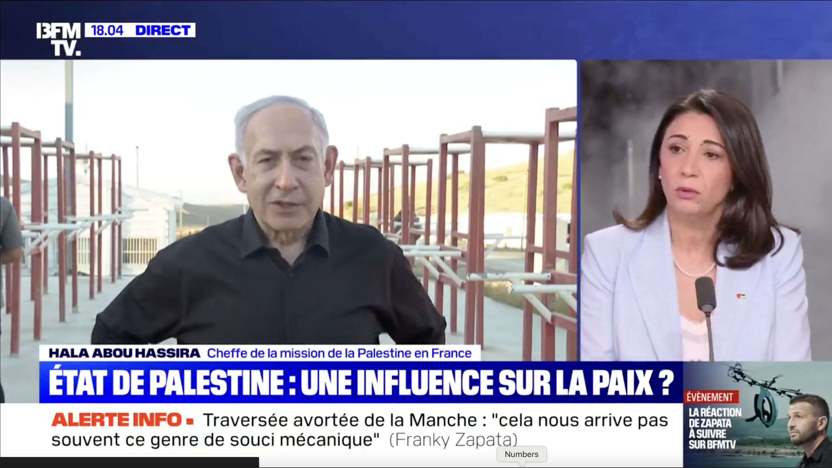 De ce point de vue-là, les lignes bougent depuis plusieurs semaines dans la plupart des médias mainstream. À titre d'exemple, la prise de parole d'Olivier Rafowicz que nous commentions ci-dessus sur BFMTV, a succédé à l'interview d'Hala Abou Hassira, cheffe de mission de la Palestine en France. Tous·tes deux ont eu un temps de parole similaire. Jean-Wilfrid Forquès précise d'ailleurs en fin de séquence : "la rédaction donne la parole aux différents protagonistes de ce conflit qui dure depuis des années".