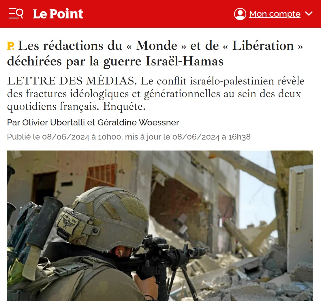 Au matin du samedi 8 juin, le Point publie une enquête, signée Olivier Ubertalli, le journaliste "médias" de la rédaction, titrée "Les rédactions du Monde et de Libération déchirées par la guerre Israël-Hamas". Quelques dizaines de minutes plus tard est ajoutée la signature de la rédactrice en chef adjointe du titre Géraldine Woessner. Et l'article est alors dépublié... pour être republié quelques heures après dans une seconde version modifiée – sans que le Point n'explique ce qui s'est passé, ou ce qui a changé. "Le conflit israélo-palestinien révèle des fractures idéologiques et générationnelles au sein des deux quotidiens français", annonce l'hebdomadaire.