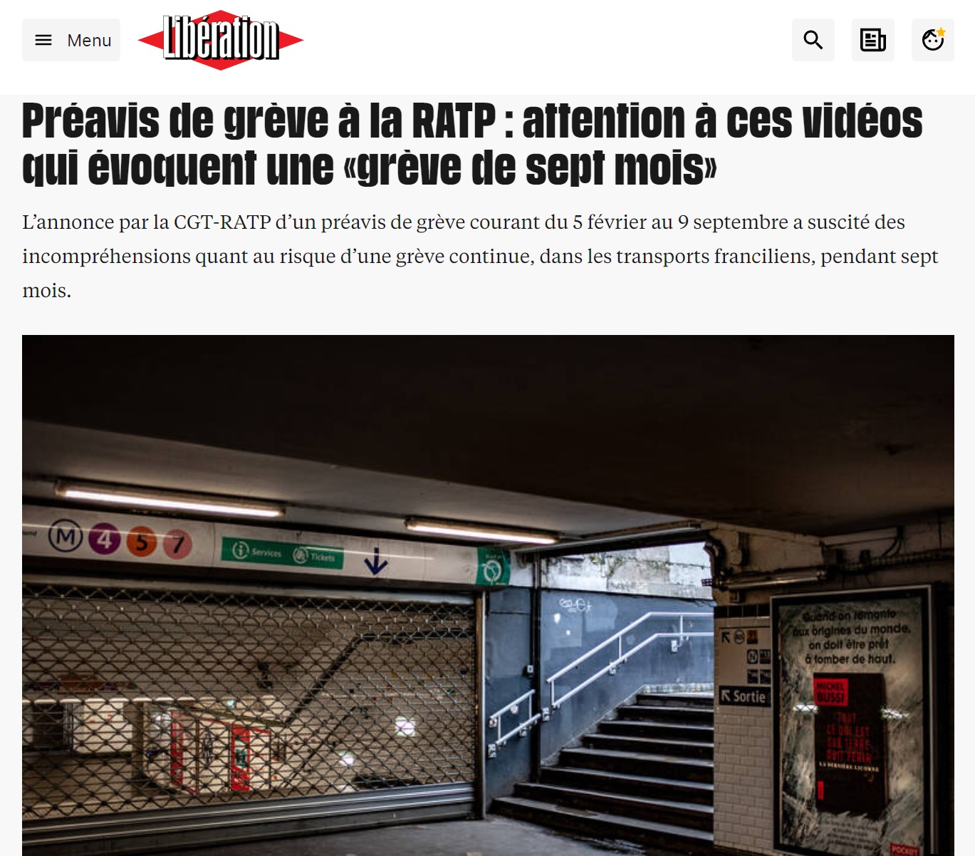 Une grève de sept mois couvrant les Jeux olympiques à la RATP ! Voilà ce qu'on pouvait déduire d'un survol des premiers titres de presse rapportant le préavis déposé par la CGT suite à l'échec des négociations annuelles avec la direction de la régie parisienne des transports, c'est-à-dire avec l'ancien Premier ministre Jean Castex. Si ces articles prennent le plus souvent soin de préciser les revendications détaillées de la CGT, ils ne permettent pas de comprendre pourquoi ce préavis dure sept mois – de quoi faire dire à certains vidéastes qu'il faut se préparer à sept mois de grève.
