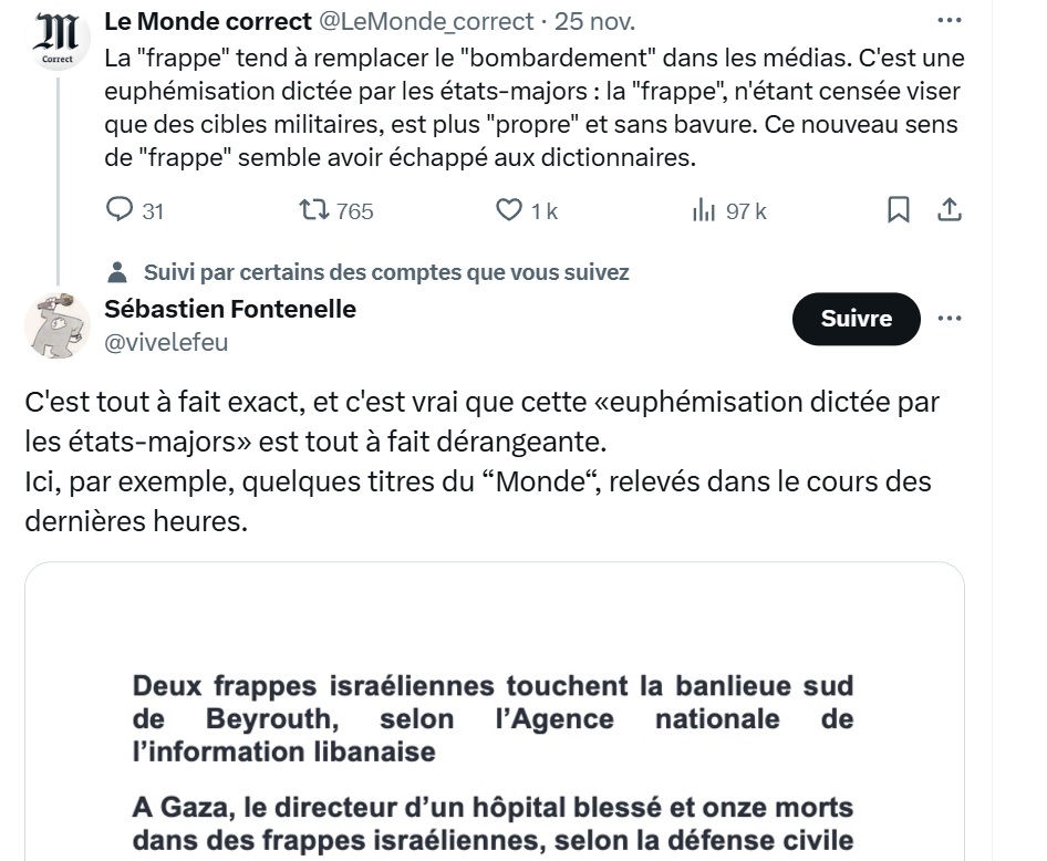 "Le mot féminin «frappe» tend à remplacer «bombardement» dans les médias. Les plus indulgents diront que c'est plus court pour les titres… d'autant que des bombardements, pardons, des frappes, il y en a beaucoup en ce moment, et cela va crescendo. Il s'agit d'une euphémisation dictée par les états-majors, en particulier celui des États-Unis lors de la première guerre du Golfe", font remarquer les correcteurs du Monde sur leur blog Langue sauce piquante le 24 novembre – version adaptée d'un billet de 2006. Lorsqu'ils postent un résumé de ce texte sur X le lendemain, il leur est immédiatement rappelé que le Monde aussi emploie à foison cette "euphémisation".