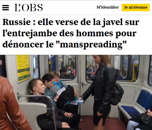 " pour faire rendre gorge aux goujats qui s’adonnent au "manspreading". Vous savez, cette tendance de certains hommes à occuper l’espace en écartant les jambes outre mesure. Croyez-le ou non, "elle déverse des bouteilles en plastique remplies d'eau de Javel diluée sur l'entrejambe de plusieurs hommes qui prennent, selon elle, trop leurs aises" expliquait L’Obs, voici quelques jours.