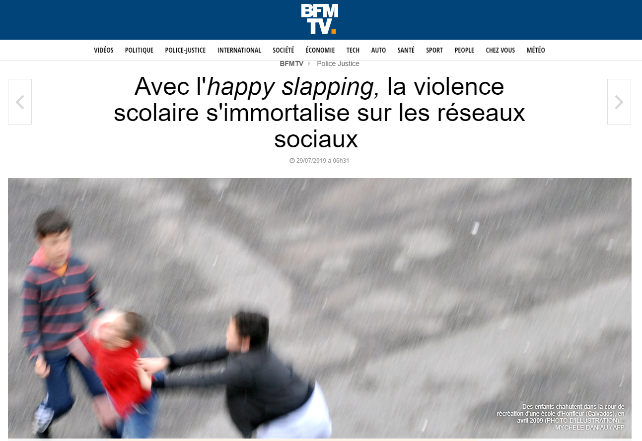 Passible de 5 ans d’emprisonnement et de 75 000€ d’amende, le "happy slapping" a été introduit dans le droit en 2007 sous la présidence de Nicolas Sarkozy, dans le projet de loi sur la prévention de la délinquance. L'article concernant cette pratique a ensuite été modifié en 2014, lors du vote de la loi pour l’égalité réelle entre les femmes et les hommes. L’article 222-33-3 du Code pénal considère ainsi comme "complice des atteintes volontaires à l’intégrité d’une personne"