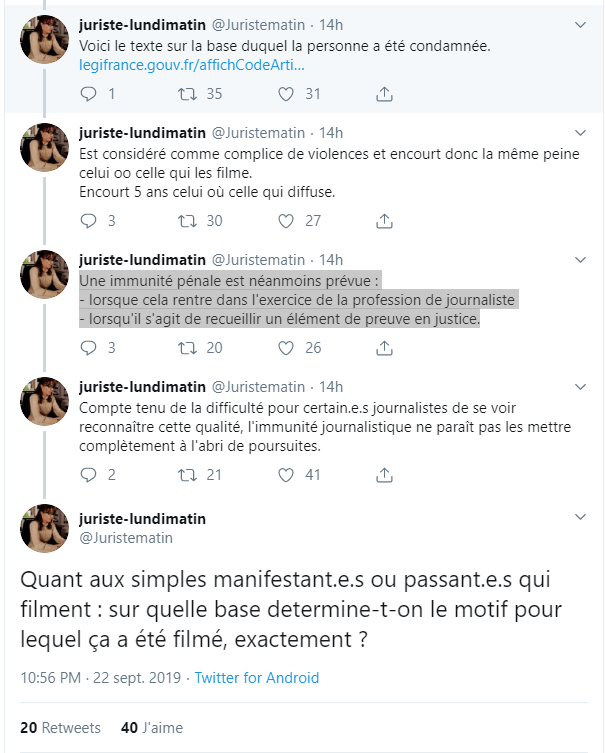 que fustigeait Estrosi lors des débats au Sénat entourant la Loi en 2007. Surtout, la décision du tribunal feint d'ignorer que les non-journalistes ont d'excellentes raisons de vouloir filmer les mobilisations, comme le souligne l'avocat Emmanuel Touraille sur France 3: "On a vu un certain nombre de dossiers arriver avec des gens qui ont fourni des images avec des interpellations abusives ou excessives de la part des forces de l'ordre, et de ce point de vue-là, les images ont permis notamment de démontrer les mensonges des forces de l'ordre. Et c'est bien pour cela qu'aujourd'hui, dans toutes les manifestations, vous avez des gens qui filment."