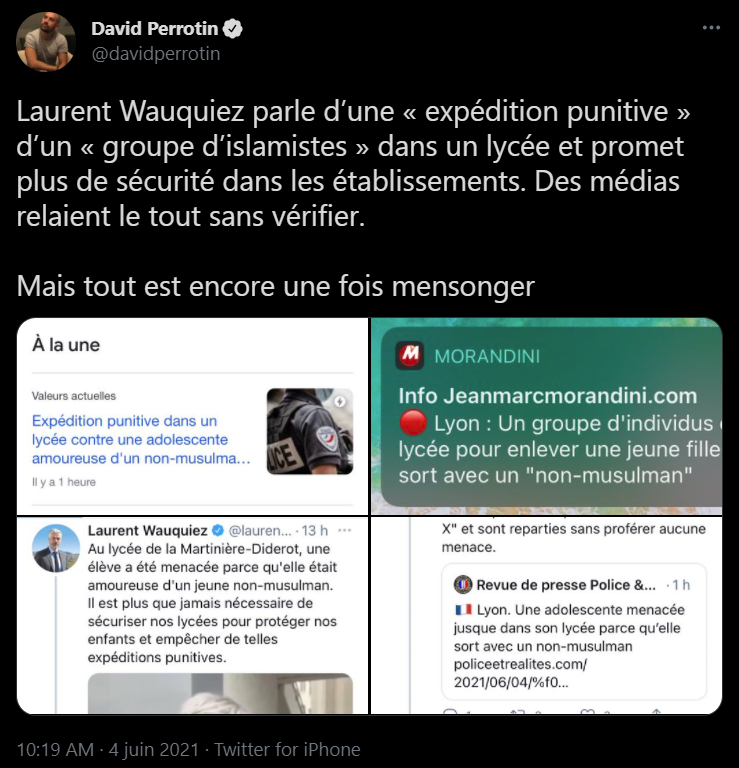 "Tout est encore une fois mensonger", réplique le 4 juin le journaliste de Mediapart David Perrotin sur Twitter en s'appuyant sur les tweets acides de la cheffe de service de BFMTV. "Laurent Wauquiez parle d’une «expédition punitive» d’un «groupe d’islamistes» dans un lycée et promet plus de sécurité dans les établissements. Des médias relaient le tout sans vérifier." Joint par ASI, David Perrotin explique avoir vu "que plusieurs articles indiquaient une «source administrative», ce qui laisse penser que ça vient de la Région, de Wauquiez, et non pas du parquet. Les médias parlent de la venue de Wauquiez, sur place il fait une vidéo dans laquelle il parle d'un groupe islamiste qui serait venu pour enlever ou frapper une musulmane, et met en avant son programme de sécurité [dans le cadre de sa candidature aux régionales]."
