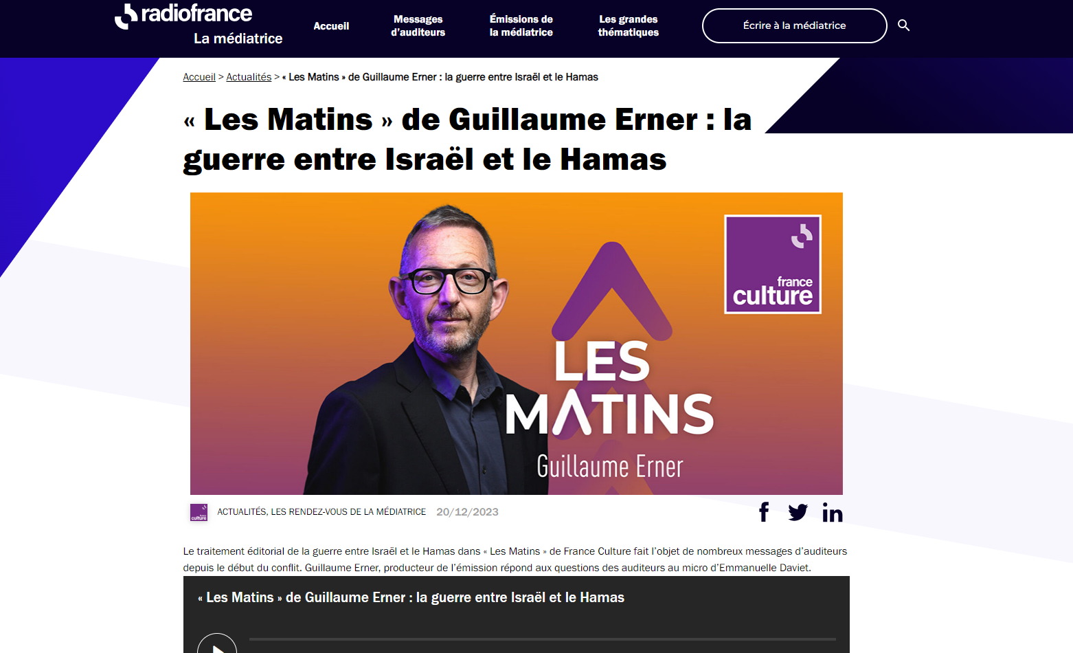 Le 20 décembre 2023, la Matinale de Guillaume Erner faisait l'objet d'un post de la Médiatrice
