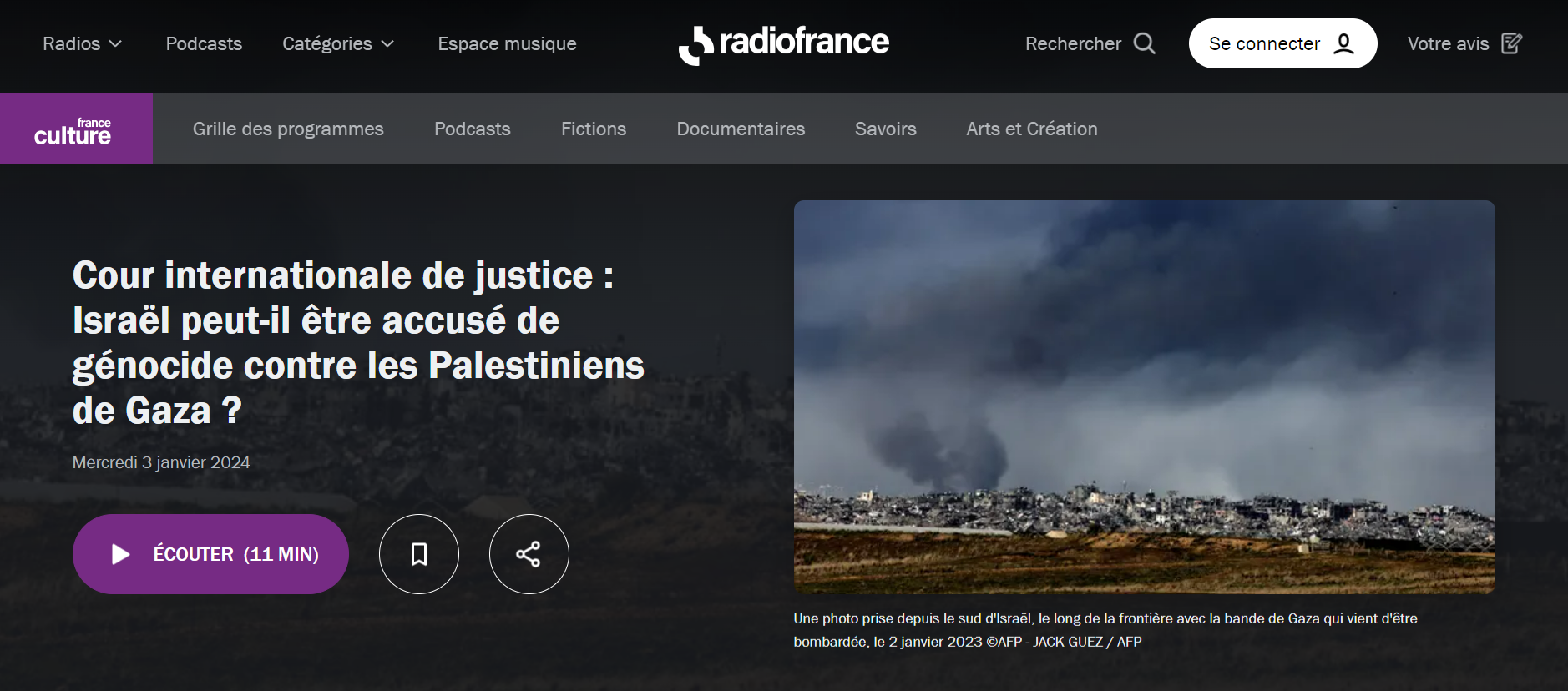 de France Culture ce 3 janvier, Rafaëlle Maison est accueillie vers 7 heures 40 au micro de Guillaume Erner, qui rappelle en introduction la saisine par l'Afrique du Sud de la Cour internationale de justice et s'interroge : "Dans quelle mesure les actions militaires d'Israël sur la bande de Gaza répondent-elles ou non à la définition juridique du génocide ? Cette requête a-t-elle des chances d'aboutir et que peut-on en attendre ?"