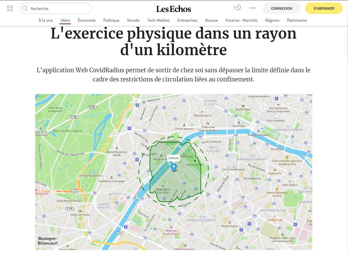 Les nombreux communiqués de presse envoyés aux médias par les concepteurs bénévoles du site web CovidRadius, deux ingénieurs en informatique et un spécialiste de la communication, ont également fait leur petit effet. "Le périmètre recommandé est calculé avec un périmètre à isodistances, qui indique des distances que l'on parcourt à pied", assure l'un d'eux aux Échos, qui ne prend pas la peine de vérifier. On constate la même absence de toute de vérification après recueil des citations enthousiastes de ces jeunes concepteurs au sein du Télégramme et des journaux du groupe de presse locale Ebra, entre autres titres. "Définir la zone que l'on peut parcourir légalement reste compliqué", pointe aussi L’Équipe en faisant la promotion du site web. Mais deux articles en particulier, l'un dans Libération, l'autre dans le Parisien, témoignent encore mieux que les autres du joli succès de la communication des trois compères de CovidRadius.
