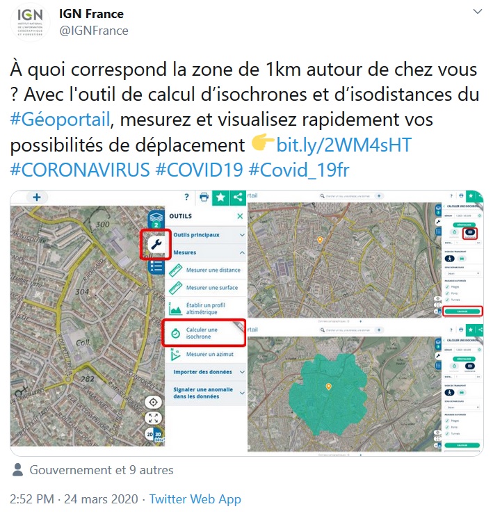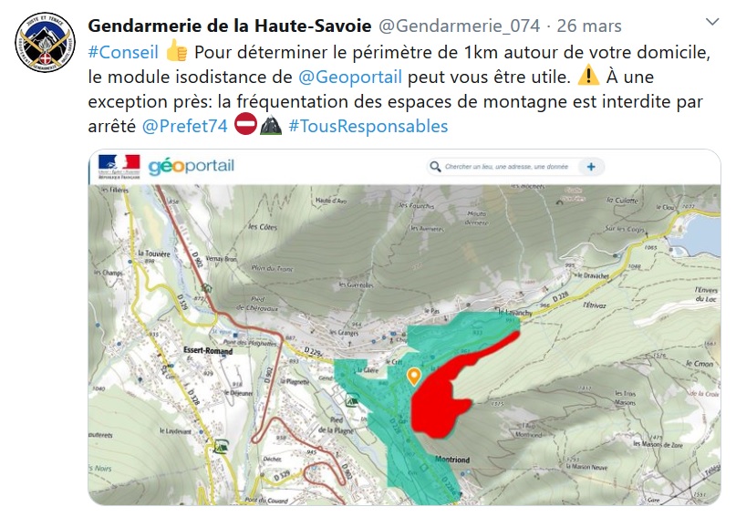Le 26 mars, la gendarmerie de Haute-Savoie publie ainsi sur Twitter l'affirmation selon laquelle "pour déterminer le périmètre de 1 km autour de votre domicile, le module isodistance de Géoportail peut vous être utile". Le 9 avril, la préfecture de l'Yonne remet le couvert, suivie le 11 avril par celle de la Saône-et-Loire : toutes deux recommandent un site web, CovidRadius, dont la page d'accueil précise bien, et faussement, que "le périmètre recommandé est calculé via isodistance". Le ministère des Sports n'est pas en reste sur Twitter. Tout comme le site officiel de l'administration, service-public.fr... du moins dans un premier temps : créée le 16 avril, la page du site service-public.fr a finalement été supprimée le 20 avril suite à un courriel du créateur du site internet unkm.fr, et redirige désormais vers la page portant sur l'attestation de déplacement.