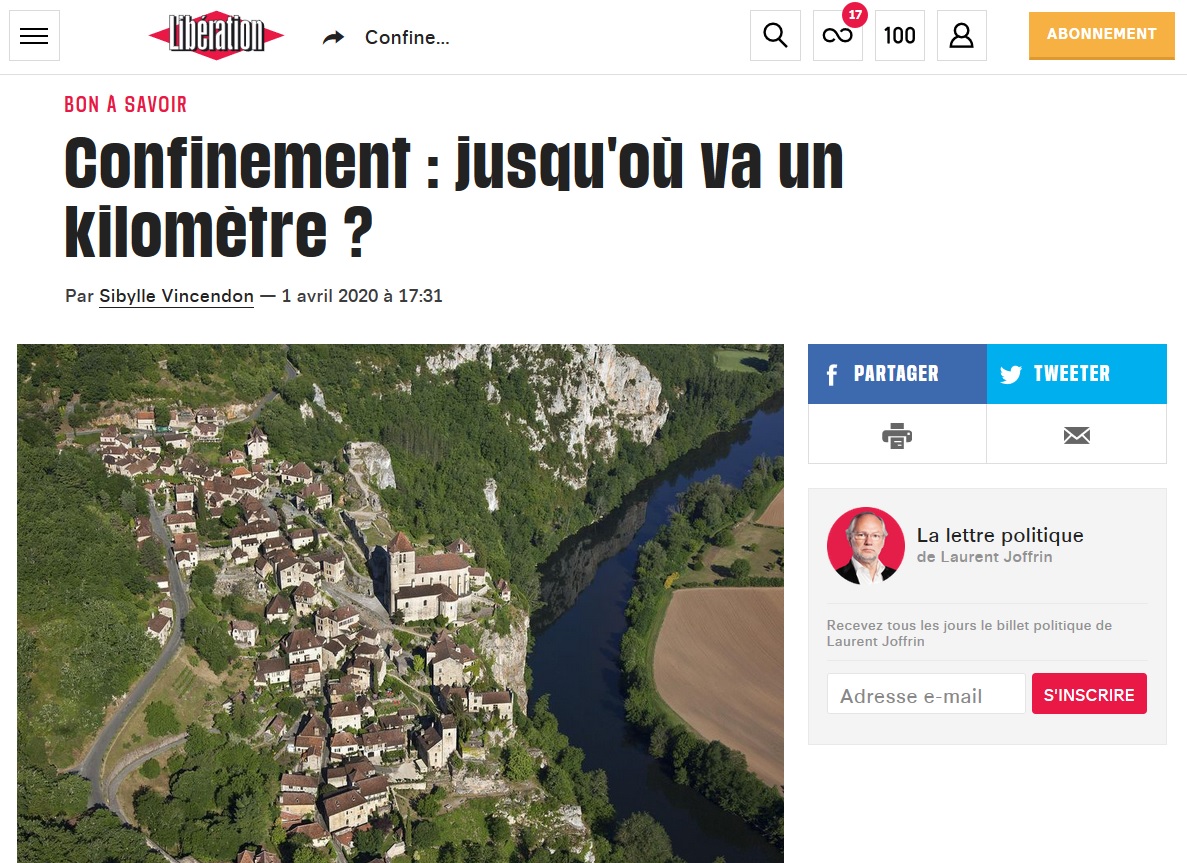 Cet honneur revient en effet à Libération, avec un article du 1er avril dont le titre, "Confinement : jusqu'où va un kilomètre ?", lui permet d'être fort bien référencé dans Google pour qui chercherait à savoir jusqu'où il peut aller courir. Dans ce texte découlant d'un communiqué envoyé par CovidRadius et incluant l'interview d'un de ses trois créateurs, le journal rivalise d'ironie. "Que les petits malins se calment tout de suite : on ne parle pas d’une distance à vol d’oiseau, qui dessine un cercle à coup sûr, mais bel et bien de celle que l’on va pouvoir parcourir à pied en se heurtant à de multiples obstacles comme des immeubles, des rues, voire des reliefs. C’est le périmètre isochrone. (...) Le kilomètre gouvernemental n’a rien d’évident", assène son autrice, la rédactrice en chef adjointe et spécialiste de l'urbanisme Sibylle Vincendon. Jointe par ASI, qui l'informe de l'erreur factuelle (un rayon est bien un rayon, donc une distance "à vol d'oiseau") autour de laquelle est construit tout son article, elle indique n'avoir effectué aucune vérification avant publication. "Étant donné qu'on se déplace tous avec les pieds, c'est un peu étrange...", commente la journaliste. "Franchement, je vais voir ce que je peux faire mais je ne sais pas si on va rectifier, ce ne sont pas des enjeux phénoménaux." En attendant, les créateurs de CovidRadius, selon des courriels qu'ASI s'est procuré, utilisent son article ainsi que celui du Parisien afin de décrocher de nouvelles louanges d'autres médias.