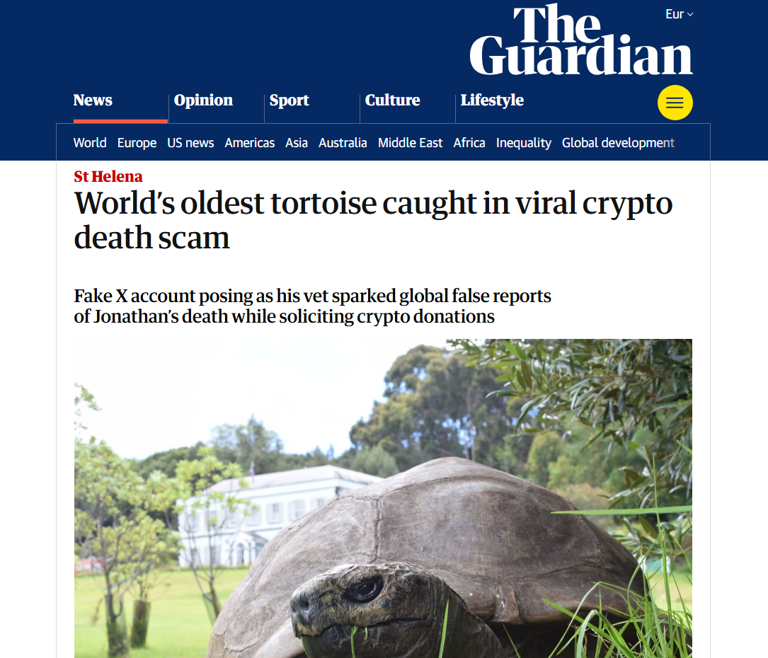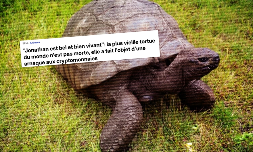 Ce 2 avril, les médias français diffusent tous des articles à la teneur similaire : non, la tortue Jonathan, le plus vieil animal terrestre du monde (que l'on sache), n'est pas morte, mais seulement victime d'une arnaque aux cryptomonnaies. Pourquoi cette multiplication de contenus journalistiques pour cette non-information ? Peut-être parce qu'ils ont bien failli se faire tous piéger par un compte X, ainsi que par la BBC, le Daily Mail, USA Today et le Parisien... si le Guardian britannique n'avait pas tué dans l'œuf la propagation de cette fausse nouvelle.