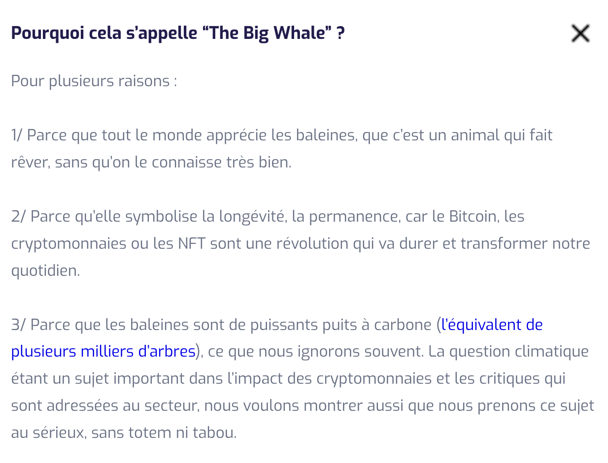 transformer notre quotidien [...] Parce que les baleines sont de puissants puits à carbone", peut-on lire sur leur site (voir capture ci-dessous). Avec ce nom, "nous voulons montrer que nous prenons ce sujet (l'impact environnemental des cryptomonnaies. ndlr) au sérieux, sans totem ni tabou"
