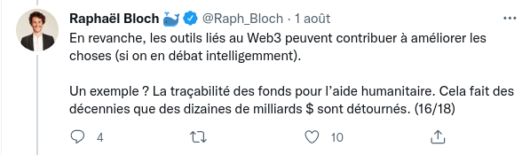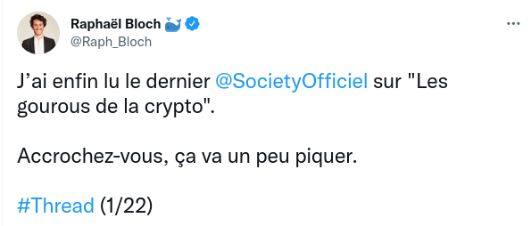 Mais dans un fil Twitter publié le 29 juillet 2022, Raphaël Bloch, journaliste et cofondateur de TheBigWhale, média en ligne spécialisé dans le web3 et proposant différentes newsletters, affirme que l'enquête de Mansuy serait passée... à côté de l'essentiel. "En lisant cet article, on aboutit à l’idée que le web3, c’est tout pourri et composé uniquement de gourous motivés par des arnaques, sans voir ce qu’il y a d’intéressant", explique-t-il à ASI quelques jours plus tard.