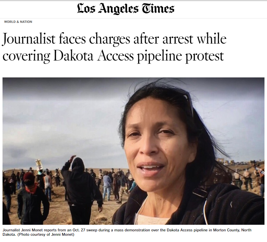 Mais les pressions concernent également les pays occidentaux. Sur les 53 violations de la liberté d'informer recensées sur les cinq dernière années (les meurtres sont inclus dans ce décompte, dont RSF a transmis les données, anonymisées pour des raisons de sécurité, à ASI), c'est le cas de six d'entre elles - Canada (2), États-Unis (1), Australie (1), France (2) et Royaume-Uni (1). Il s'agit des interpellations ou des poursuites engagées à plusieurs reprises contre des journalistes ayant couvert des manifestations, que ce soit à Standing Rock aux États-Unis (c'est par exemple le cas de la journaliste Jenni Monet, en illustration, qui a été arrêtée en compagnie de manifestantes et détenue avec elles, pendant sept heures, dans une cage en métal, dans le garage de la prison du comté, avant son transfert dans une cellule normale), sur les projets de gazoducs ou d'oléducs traversant des terres des communautés autochtones au Canada, ou sur les actions du mouvement Extinction Rebellion au Royaume-Uni et en France. Dans l'hexagone, l'ONG pointe aussi les pressions subies par la journaliste Inès Léraud, dans le cadre de sa couverture des causes de la pollution par les algues vertes en Bretagne (voir notre émission sur le sujet).