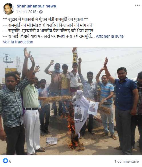 Comme l'explique une enquête du Monde réalisée dans ce cadre, Jagendra Singh, ancien correspondant local de journaux en langue hindi, avait lancé sa propre page Facebook d'information et de révélations, Shahjahanpur News, après avoir vu quelques scandales être étouffés par la corruption de ses supérieurs. Le 27 avril 2015, il commence à y accuser un des ministres du gouvernement local de l'Uttar Pradesh, Ram Murti Verma, de détournement d'aide alimentaire, puis de liens avec les mafias des sables. Le 1er juin 2015, la police se rend au domicile du journaliste. Il est ensuite emmené à l'hôpital, brûlé à 60%, et accusant, dans une vidéo tournée par sa famille, la police et le ministre. Il décède sept jours après. Dans l'enquête, c'est la version de la police qui prévaudra : suicide par immolation du journaliste. "C’est un triangle de fer. Un journaliste peut dénoncer le Premier ministre [du pays] . Mais s’il écrit sur des affaires très locales, il est vite neutralisé, très peu osent", explique Suman Gupta, membre d’un comité d’enquête de journalistes formé après la mort du reporter, au Monde.