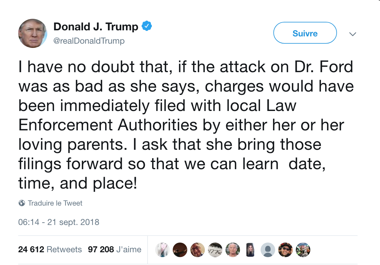 Un énième tweet polémique. Une énième charge contre les femmes. Donald Trump, tristement connu notamment pour ses sorties outrancières contre les femmes, a réitéré vendredi 21 septembre, sur Twitter. Le président américain s'en est pris violemment à Christine Blasey Ford qui accuse le juge Brett Kavanaugh, candidat à la Cour suprême des Etats-Unis, de l'avoir agressée sexuellement au début des années 1980. Il reproche à cette universitaire de 51 ans de ne pas avoir porté plainte au moment des faits, mettant ainsi en doute son témoignage. "Si les attaques avaient été aussi graves que ce que dit le Dr. Ford, il y aurait eu une plainte d’elle ou de ses parents aimants"