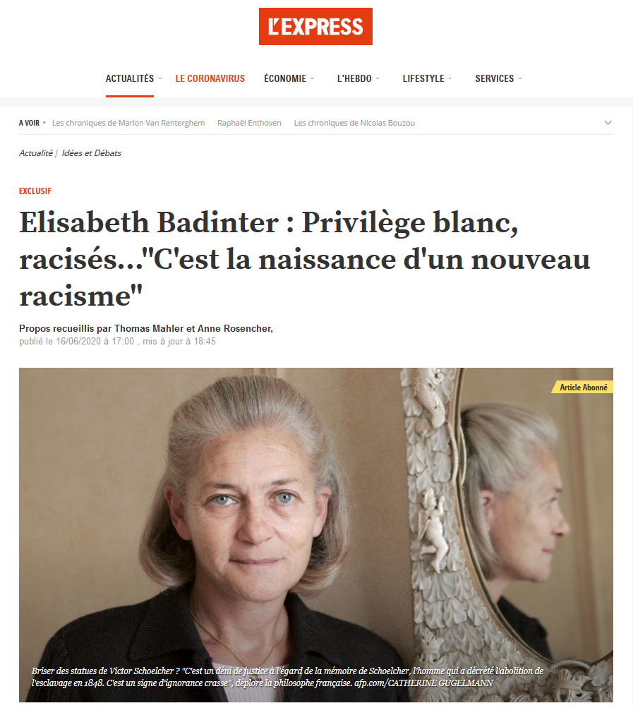 à partir d’un entretien avec Elisabeth Badinter. La philosophe-actionnaire de Publicis n’est pas la seule à dénoncer l’importation de discours américains fondés sur un vocabulaire dit « racialiste ».