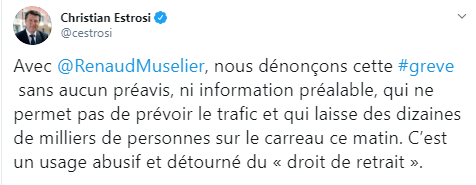 a déclaré Franck Lacroix, le directeur général de la SNCF lors d'une conférence de presse."C’est un usage abusif et inadmissible du "droit de retrait" qui est un usage détourné du droit de grève. Il s’agit en réalité d’une grève sauvage, organisée sans aucun respect de la loi et des passagers, sans préavis ni mise en œuvre d’un service minimum",