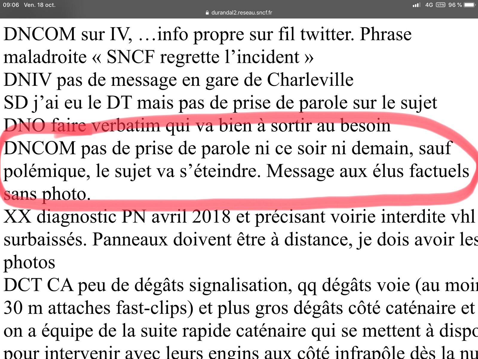 Or la SNCF a décidé de ne pas communiquer sur le sujet, en espérant que le mouvement resterait cantonné en Champagne-Ardennes et s'éteindrait de lui-même. C'est ce que révèlent les échanges du fil "Durandal", une application interne à l'entreprise qui signale en temps réel tous les incidents en cours ainsi que les remèdes qu'y apporte la direction, et qu'ASI a pu consulter. La Direction nationale de la communication ("DNCOM") écrit ainsi : "Pas de prise de parole ni ce soir ni demain, sauf polémique, le sujet va s'éteindre. Message aux élus factuels, sans photo"