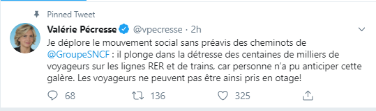 " des voyageurs sur Twitter. La présidente de la région Ile-de-France, qui se bat pour instaurer un service garanti dans les transports aux heures de pointe en cas de grève et pour allonger le préavis à 72 heures, a également indiqué dans un autre tweet que le service SNCF non assuré ne serait "pas payé par Ile-de-France Mobilités".