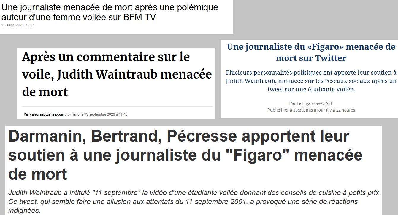 et autrice en 2014 d'un ouvrage intitulé Islamophobie, la contre-enquête, aujourd'hui présidente de l'INRER, l'institut de recherches et d'études sur les radicalités, qu'elle a fondé. "Tous les articles reprennent en chœur que Judith Waintraub a reçu "des" menaces de mort, mais on n'a vu qu'un seul tweet", fait-elle remarquer. C'est en effet toujours le même tweet que l'on retrouve, cité par les soutiens de Waintraub et par l'AFP. Libération, avec prudence, évite d'ailleurs le pluriel pour parler d'"au moins une menace de mort", de même que... le Figaro, qui précise le texte de l'AFP en citant "une menace de mort sur les réseaux sociaux émanant d'un compte anonyme".