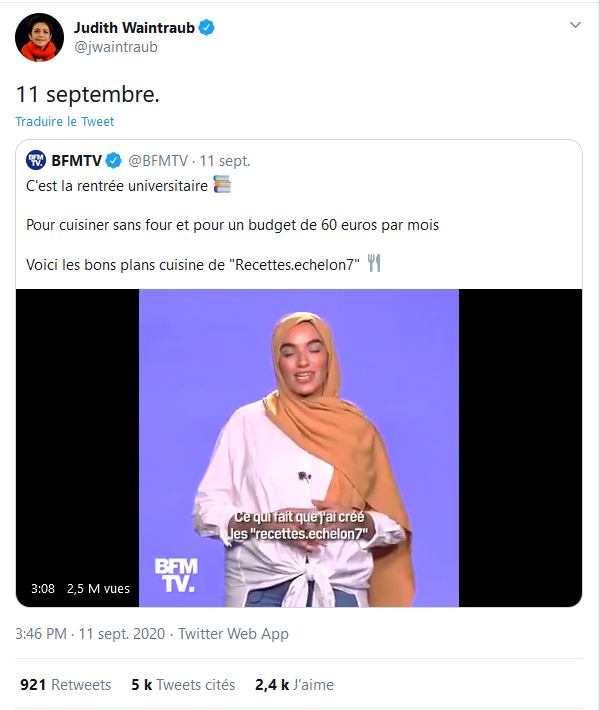 Seulement voilà, Imane Boun porte un hijab. Et la vidéo provoque des réactions en cascade. De nombreux tweets (2900 commentaires sous la vidéo et 6500 retweets commentés trois jours plus tard, au 14 septembre, qui comptent aussi des soutiens) tombent sur la jeune fille, pour port de signe extérieur de religion. Parmi eux, un tweet se fait particulièrement remarquer. Il s'agit de celui de Judith Waintraub. Journaliste au Figaro Magazine