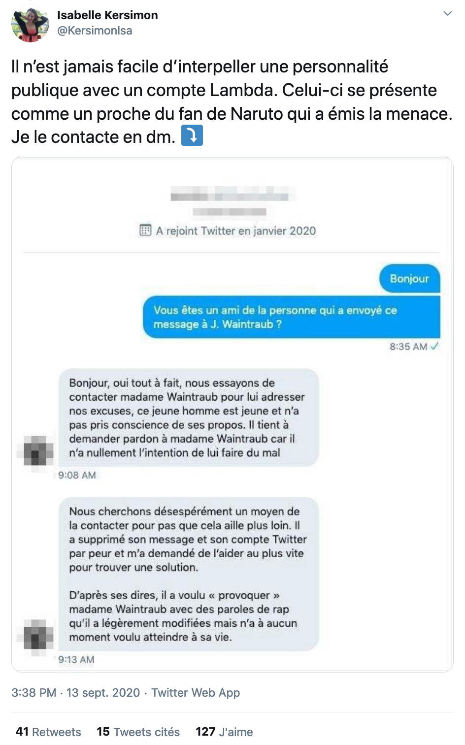 Qui plus est, cette menace, dont les propos sont évidemment très violents et condamnables, a néanmoins toutes les apparences de ne pas être sérieuse. Dans un thread publié dimanche 13 septembre après-midi, Kersimon indique être entrée en contact avec un compte Twitter qui cherche à joindre Judith Waintraub via Twitter depuis la publication des menaces (dont ASI a pu voir les messages, toujours en ligne). Affirmant être un proche de l'auteur du tweet de menace, @Mickzer_P13, le propriétaire du compte indique que celui-ci est "jeune" et "souhaite demander pardon à Mme Waintraub car il n'a nullement l'intention de lui faire du mal".