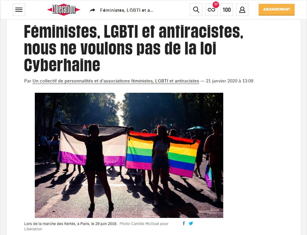 ce mardi 21 janvier, à quelques heures du deuxième examen par l'Assemblée Nationale de la proposition de loi Avia. Les signataires, parmi lesquels l'association Les Effronté.es, les militantes Caroline de Haas et Rokhaya Diallo, ou encore l'Inter-LGBT, dénoncent un projet "qui ne répond pas à la nécessité de lutter contre la haine en ligne et le cyberharcèlement, et ouvrira la porte à une censure hors de tout contrôle judiciaire"