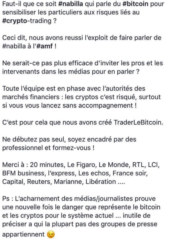 A commencer par… l’Autorité des Marchés Financiers. Qui s’est fendu le 9 janvier d’un tweet préventif à l’intention de… Nabilla : "Le bitcoin c’est très risqué ! On peut perdre toute sa mise. Pas de placement miracle. Restez à l’écart.