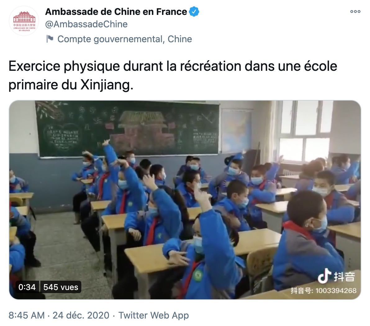 Autre tweet balancé par l'ambassade de Chine en France ce 24 décembre : des enfants d'une école du Xinjiang effectuant une chorégraphie en guise d'activité sportive.