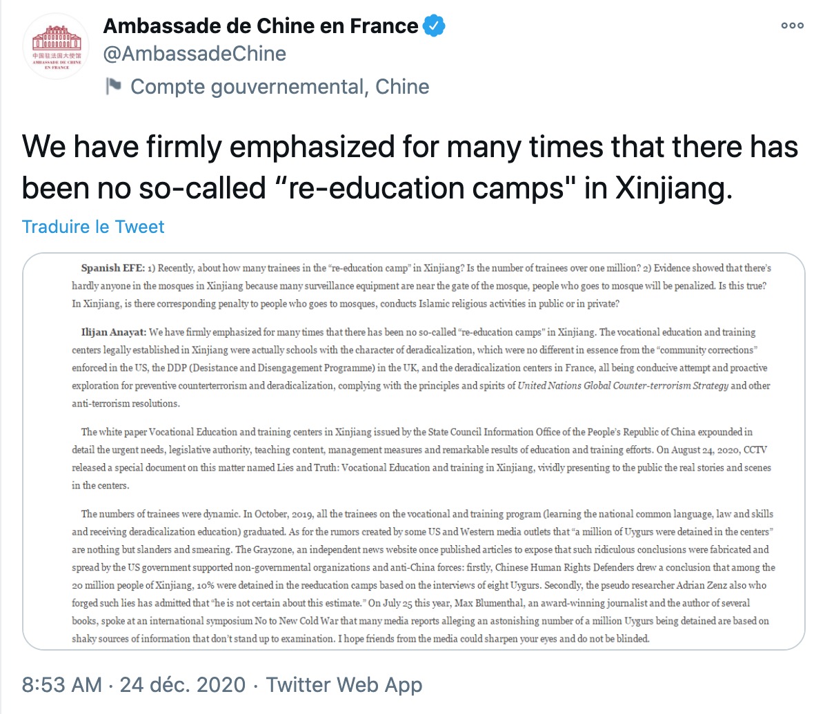 Le 21 décembre, le ministre des Affaires étrangères chinois, Wang Yi, tenait une conférence de presse relative à la situation au Xinjiang, dont la retranscription est disponible ici. Il était accompagné d'Ilijan Anayat, porte-parole du Bureau d'information du Xinjiang, organe gouvernemental. Un extrait en particulier a retenu l'attention du community manager de l'ambassade chinoise : celui concernant les camps de rééducation dans lesquels sont envoyés de force les Ouïghours.