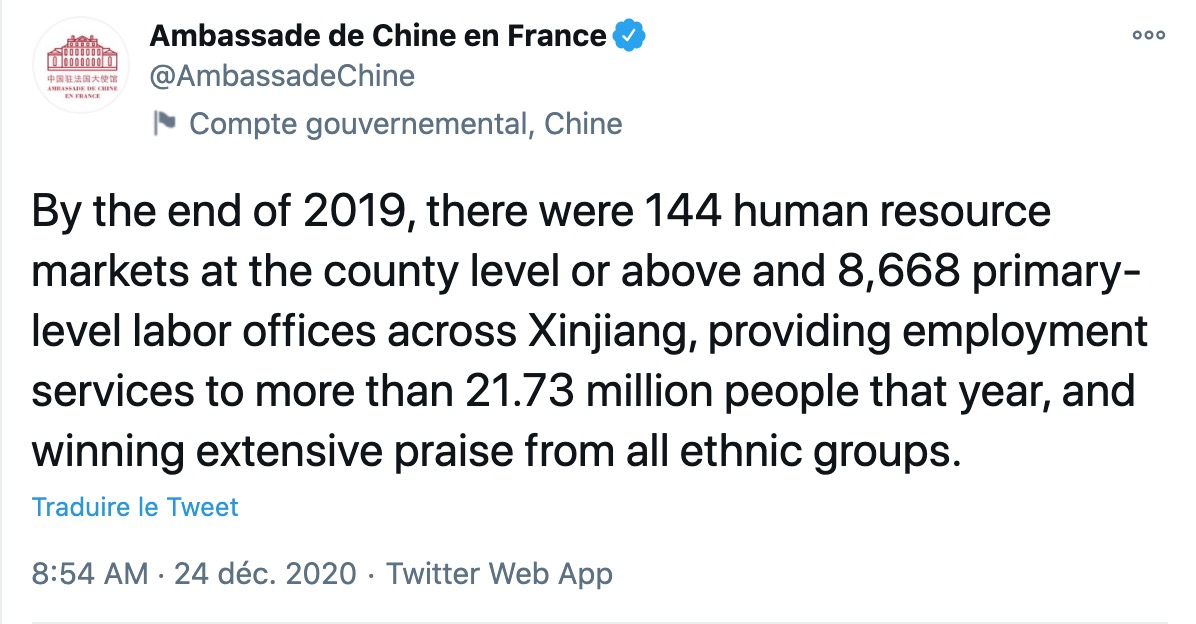 Deuxième tweet, deuxième tentative des autorités chinoises d'éteindre la polémique sur la situation des Ouïghours. Selon l'ambassade chinoise en France, les "bureaux de l'emploi" du Xinjiang, censés assurer un travail aux citoyens chinois, recevraient l'approbation de "tous les groupes ethniques".
