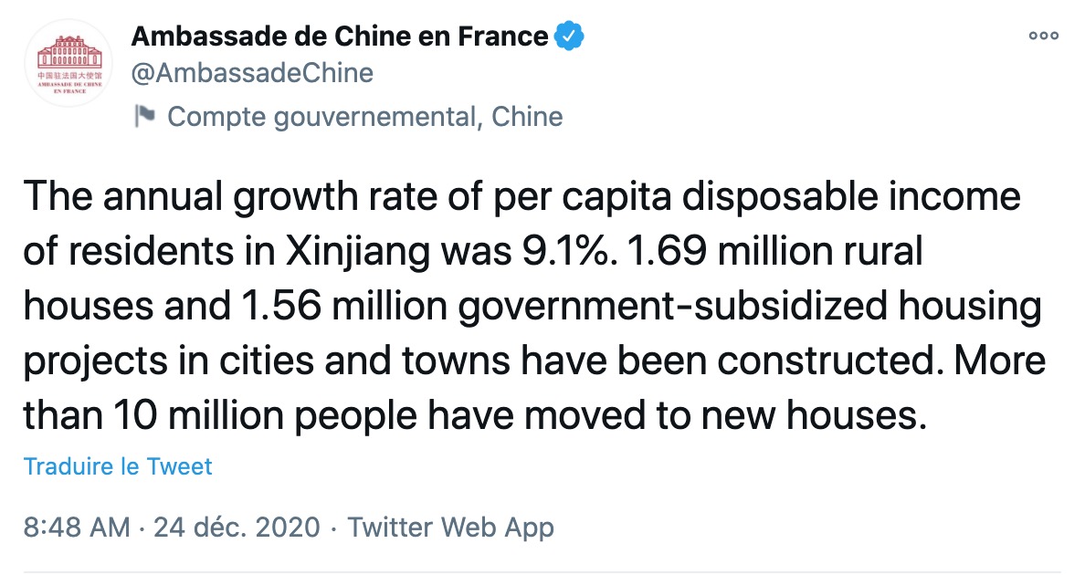 L'ambassade de Chine twitte et ment sur les Ouïghours
