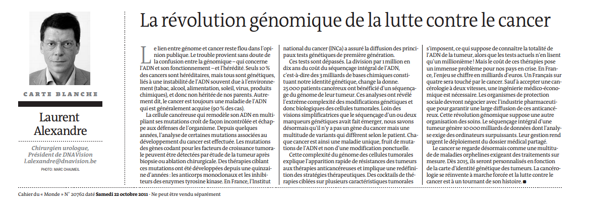 C'est en 2011 que le chirurgien débute véritablement sa carrière médiatique, en devenant un chroniqueur régulier du cahier Science&Techno du quotidien. La collaboration durera jusqu'en 2018, et suscitera des remous. Car c'est l'époque à laquelle Alexandre commence à écrire sur sa nouvelle marotte : la génétique. Comme toujours chez lui, le businessman n'est jamais loin derrière le penseur. Tandis que d'une main il écrit des chroniques dans le Monde sur les vertus du séquençage du génome, de l'autre il gère DNAVision, son entreprise de... séquençage du génome, basée à Bruxelles.
