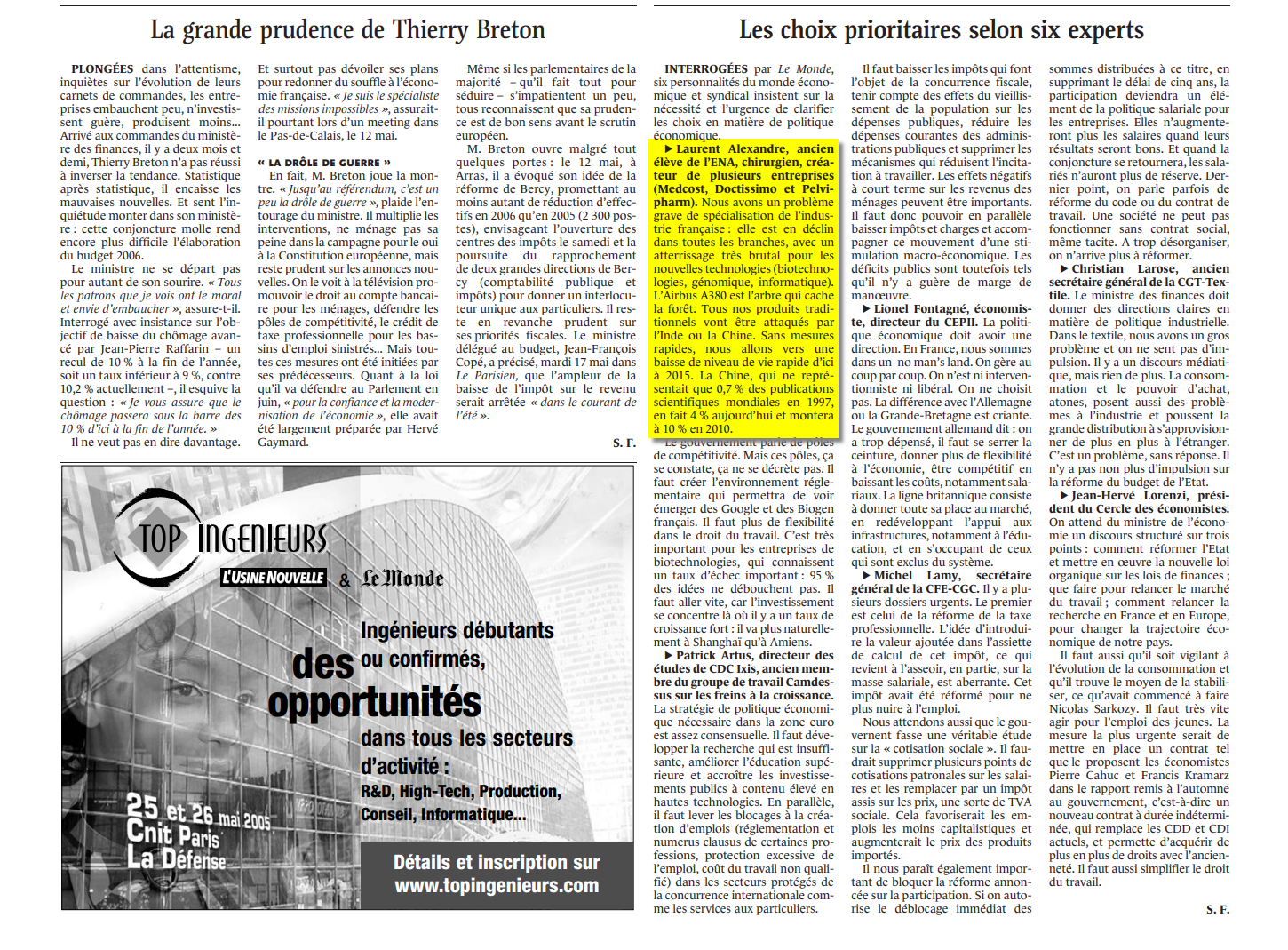 En 2005, c'est ainsi au titre d'"ancien élève de l'ENA, chirurgien, créateur de plusieurs entreprises (Medcost, Doctissimo et Pelvipharm)" qu'il est interrogé par le quotidien, aux côtés d'autres "experts", sur la politique économique de la France. Pas d'outrances dans sa réponse, mais une ligne libérale ("plus de flexibilité dans le droit du travail" pour faire émerger des "pôles de compétitivité") somme toute logique pour celui qui fut, quelques années plus tôt, secrétaire national du parti d'Alain Madelin, Démocratie libérale (information rapportée par GQ).