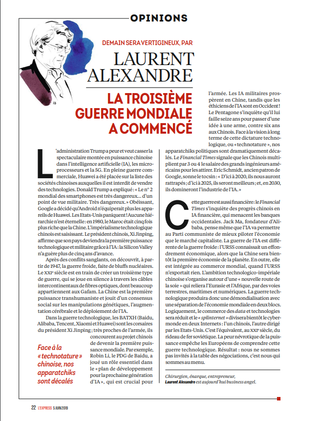 Contacté par mail le 4 septembre, notamment concernant ses chroniques dans L'Express, Laurent Alexandre ne nous a pas répondu.