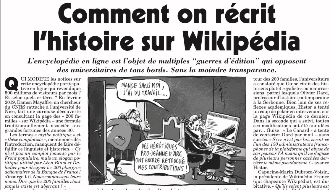 L'article signé du célèbre pseudonyme "Jérôme Canard" – utilisé régulièrement dans les colonnes de l'hebdomadaire – entend lever le voile sur certains contributeurs de l'encyclopédie en ligne participative Wikipédia. Le 29 juin, le Canard enchaîné publie un article sous le titre : "Comment on récrit l'histoire sur Wikipédia". Le palmipède pense avoir levé un loup : comment certains utilisateurs de la plateforme profitent de leur position pour influencer la rédaction de certaines pages, et y glisser leurs préjugés idéologiques.