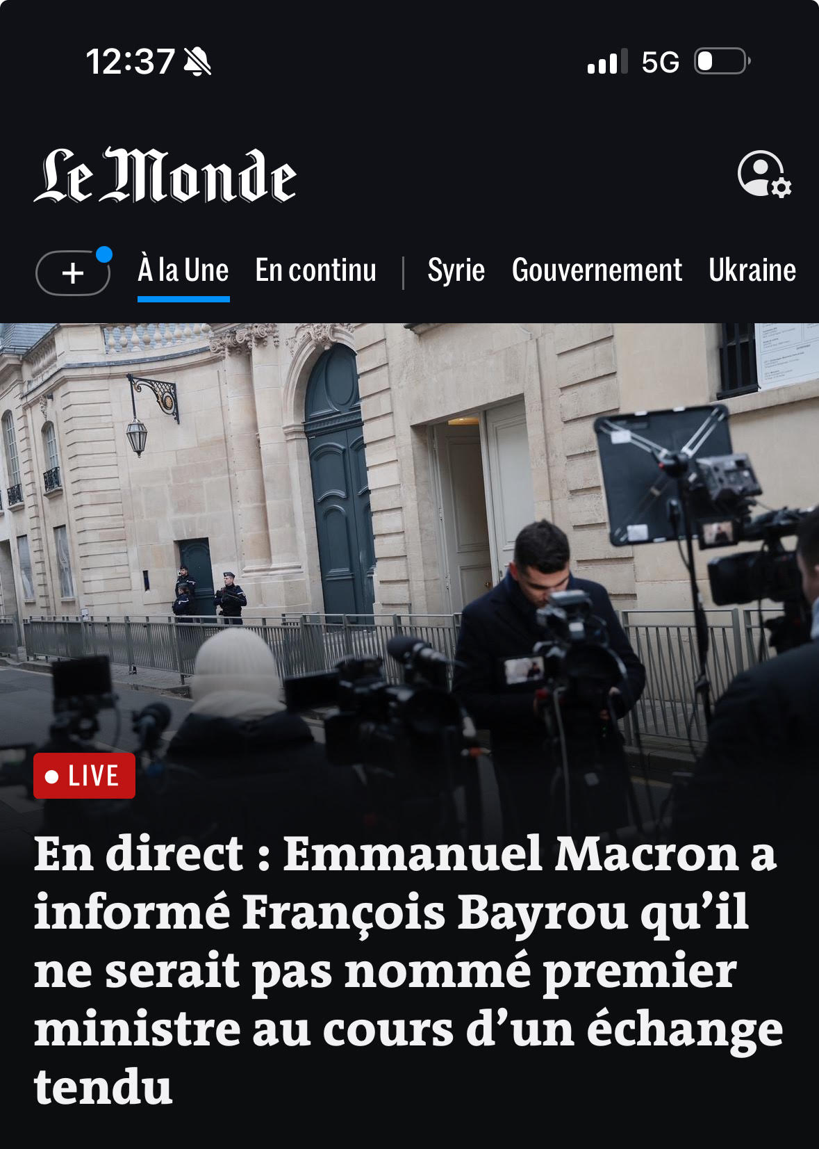 À 12h37, soit quelques minutes seulement avant la nomination officielle de François Bayrou, on pouvait encore lire en une du site du Monde :