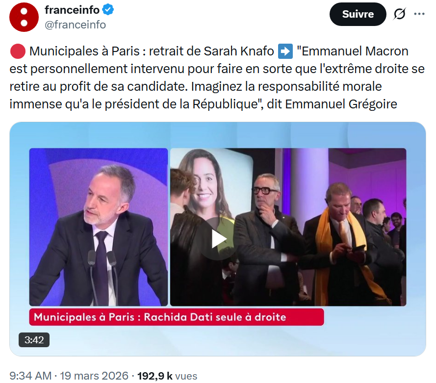 "Emmanuel Macron est personnellement intervenu pour faire en sorte que l'extrême droite se retire au profit de sa candidate." La déclaration d'Emmanuel Grégoire, au matin du jeudi 19 mars sur le plateau de la chaîne franceinfo, fait réagir les deux journalistes-présentateurs. Et pas qu'eux, puisqu'elle déclenche aussitôt, à trois jours du second tour des élections municipales. "Emmanuel Macron n'arrive même plus à se faire respecter de ses propres alliés, mais il va avoir une influence sur ses opposants ? Soyons sérieux", répond aussitôt l'intéressée, Sarah Knafo, sur X.