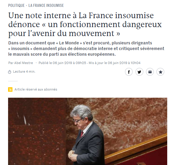 Illustré par la photo d'archives d'un Mélenchon tête baissée, l'article commence fort : "C’est un texte de cinq pages qui secoue La France insoumise (LFI) et qui tombe au pire moment : juste après la défaite aux élections européennes où la liste emmenée par Manon Aubry a recueilli 6,31 % des suffrages, et en pleine crise interne autour de la stratégie à adopter. Une note qui va par ailleurs gâcher l’...